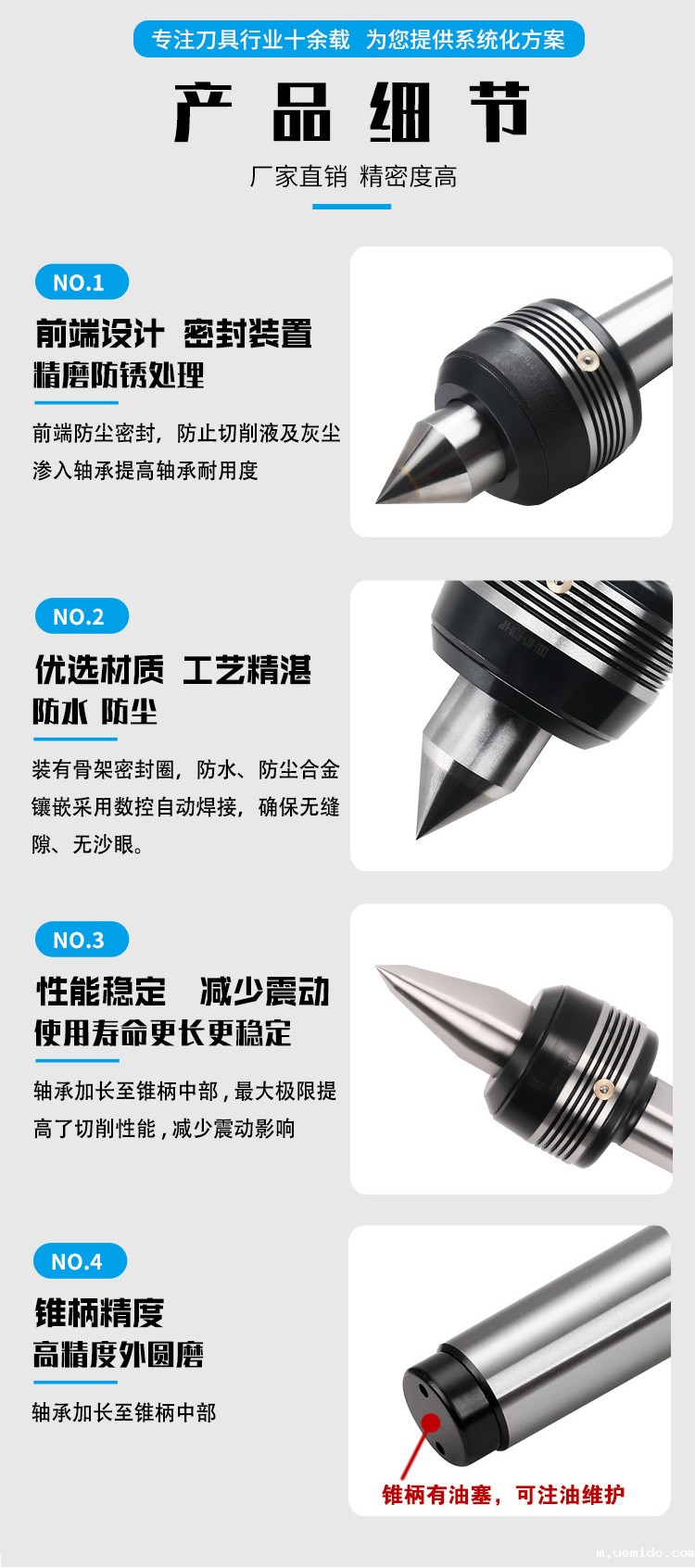 2、低摩擦:通过轴承的支撑,顶尖体与顶尖套之间的摩擦阻力很小,减少了能量损耗和发热,提高了加工效率和质量。